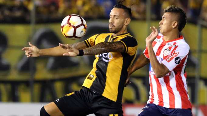 El jugador del Guaraní Marcelo Cañete (i) disputa el balón con Victor Cantillo (d) de Atlético Junior durante un partido de la Copa Libertadores en el estadio Defensores del Chaco de Asunción (Paraguay). EFE/Andrés Cristaldo