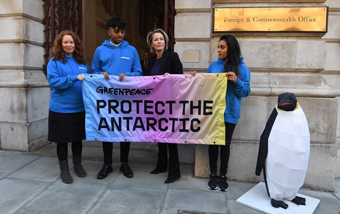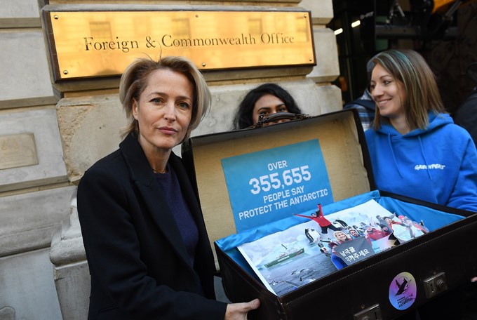 La actriz Gillian Anderson entregó hoy al Gobierno del Reino Unido una petición promovida por la organización ecologista Greenpeace, firmada por dos millones de personas en todo el mundo, para crear una zona protegida en la Antártida.