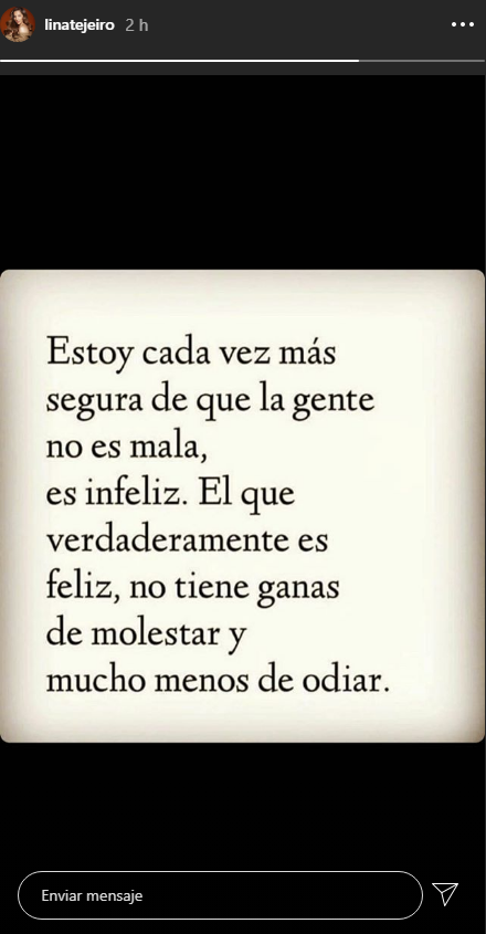 Además de este trino, Lina también publicó en sus historias de Instagram una leyenda que dice: “Estoy cada vez más segura de que la gente no es mala, es infeliz. El que verdaderamente es feliz, no tiene ganas de molestar y mucho menos odiar”.