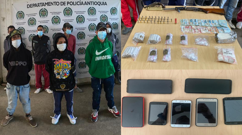 Además, se informó que para la ejecución de los delitos eran instrumentalizados varios menores de edad. La captura y aprehensión de los investigados fue coordinada por la Fiscalía y ejecutada por miembros del Gaula de la Policía el 19 de agosto en Amagá, donde fueron incautadas 2 armas de fuego defensa personal, 32 cartuchos de diferente calibre, 120 gramos de cocaína, 148 dosis de marihuana y $641.000 en efectivo.