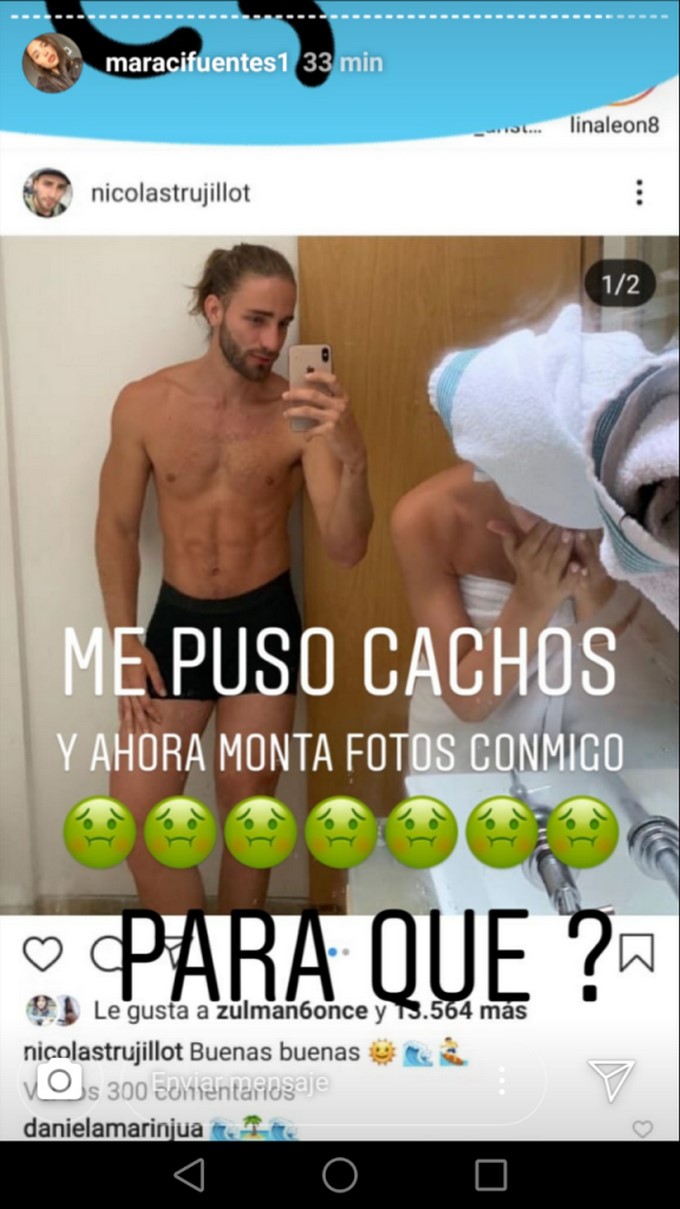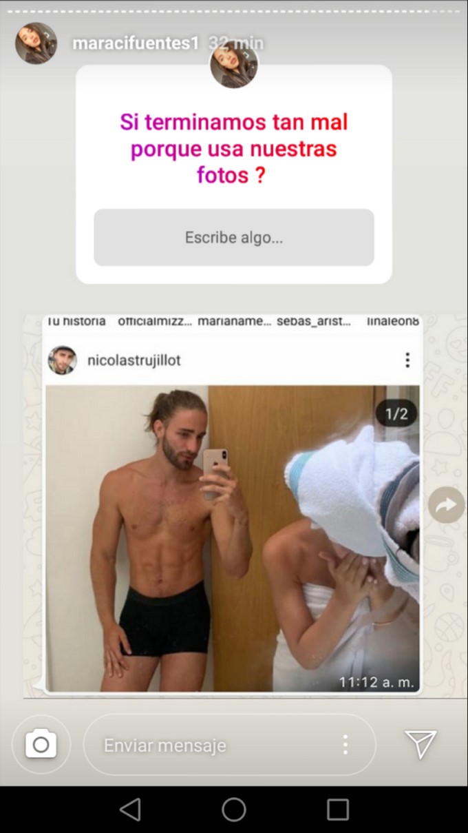 “Me puso los cachos y ahora monta fotos conmigo. ¿Para qué?”, “¿si terminamos tan mal, por qué usa nuestras fotos?”, fue las preguntas que se hizo Mara en sus historias mostrando el pantallazo que hizo de la publicación de Nicolás. Luego, la misma Cifuentes publicó más fotos íntimas de los dos, que se habrían hecho el pasado 13 de mayo, para dejar claro que ella sí es la que aparece en las imágenes posteadas por Trujillo.