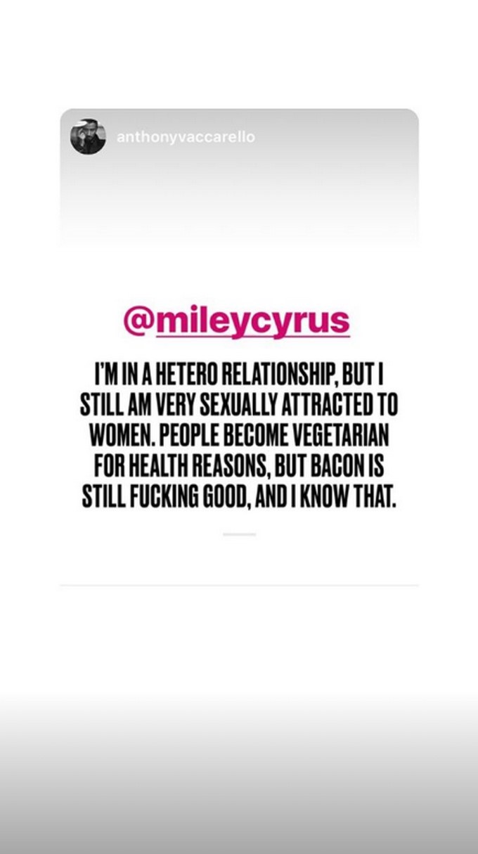 Para contrastar, Miley también compartió algunas de sus canciones preferidas que le recuerdan a su mascota fallecida y reposteó un story de Anthony Vaccarello en el que cita a la intérprete de “Malibu” cuando dice que “estoy en una relación heterosexual, pero aún me siento atraída sexualmente por las mujeres”.
