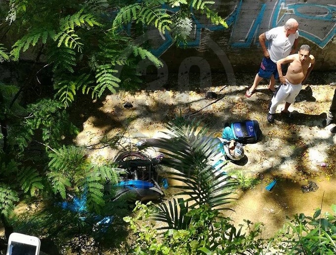 FOTOS. Mujer y su moto terminan en la canalización luego de accidente de tránsito