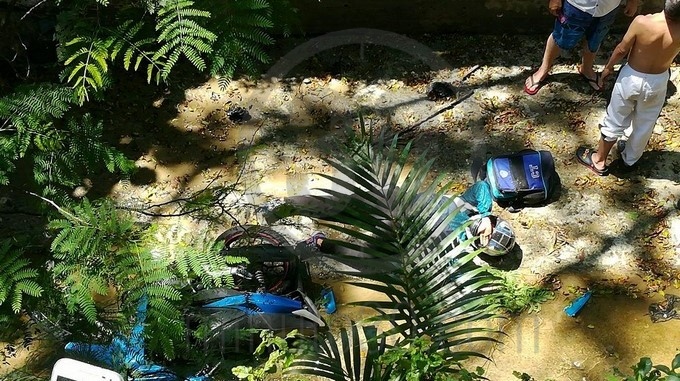 FOTOS. Mujer y su moto terminan en la canalización luego de accidente de tránsito