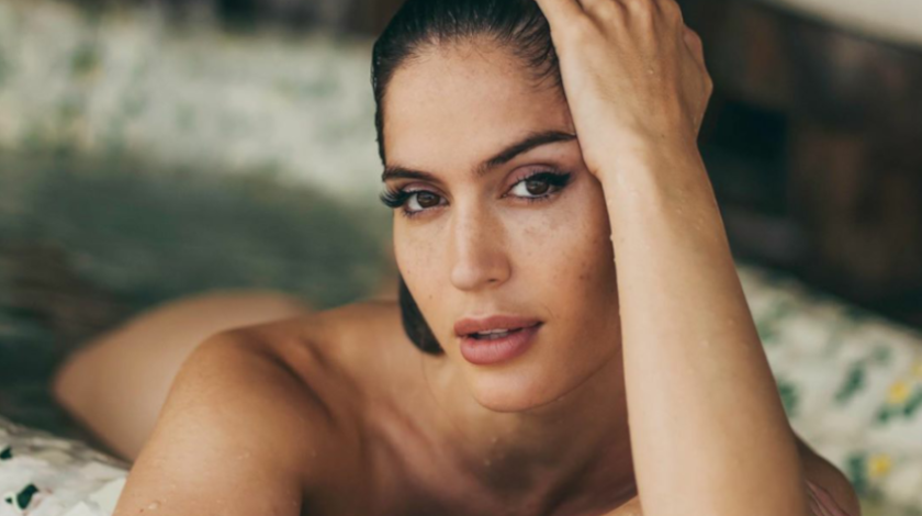 Natalia se ve en una tina rocosa embaldosada de Tulum, México, haciendo varias poses, unas más sensuales y otras muy editoriales, como si se tratara de un photosoot de moda muy húmero y con un maquillaje perfecto.