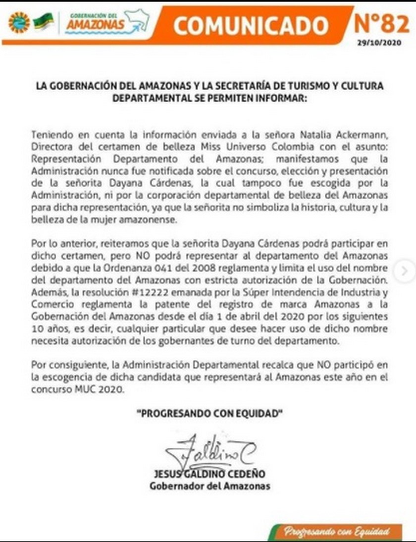 A través de un comunicado, la Gobernación de Amazonas rechazó que Dayana Cárdenas representara a ese departamento. Así mismo, recalcó que “cualquier particular que desee hacer uso de dicho nombre necesita autorización de los gobernantes de turno”.
