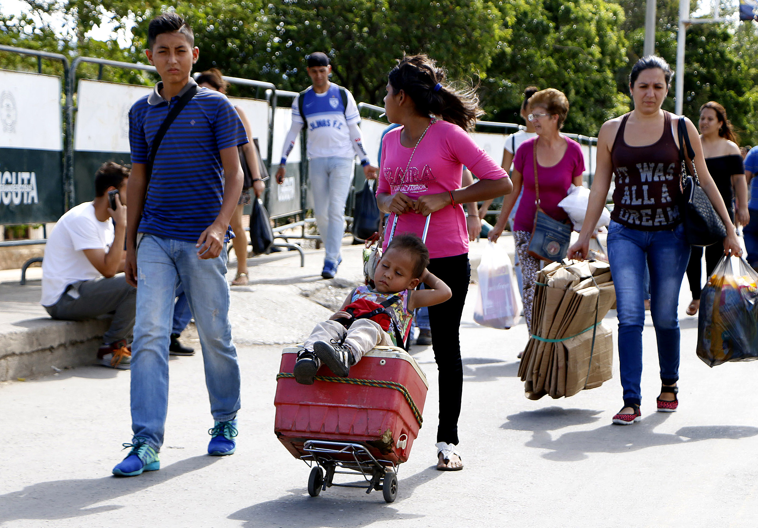 Mientras esperan su turno, familias enteras se sientan bajo la sombra de los árboles con maletas, coches de niños e incluso mascotas con la expectativa de dejar atrás las penurias a las que se ven sometidos a diario.