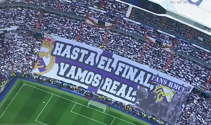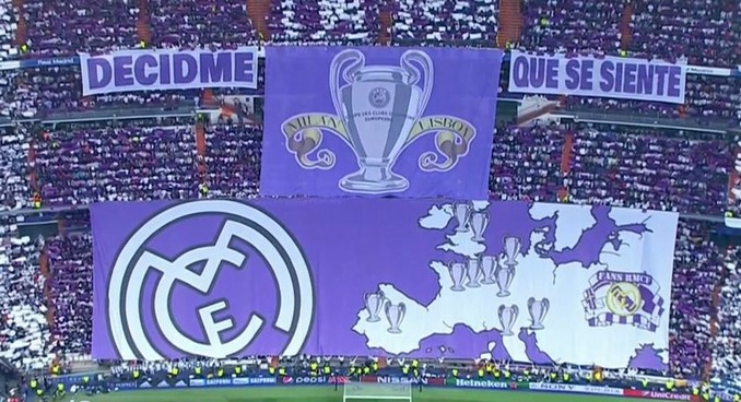 En una de las tribunas laterales, los seguidores del Merengue hicieron un mosaico en el que le dicen al Colchonero, “decidme qué se siente”, enseñándoles una copa y los lugares en donde ganaron la Champions.