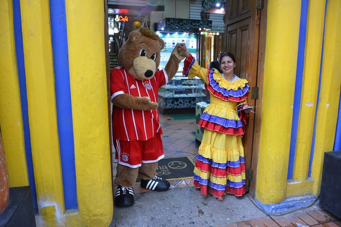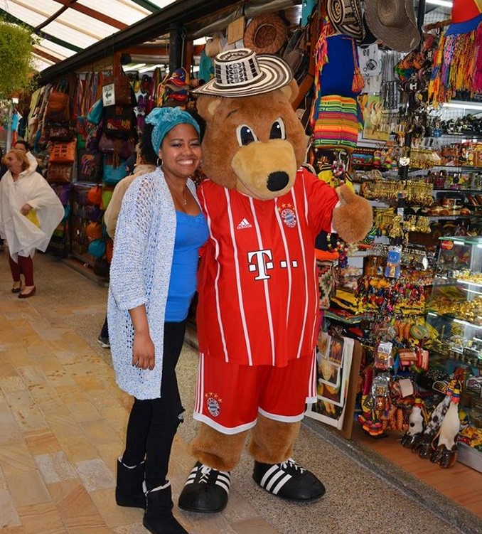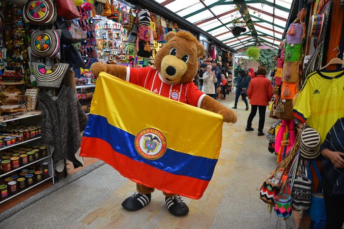 La mascota oficial del Bayern Múnich, el oso Berni, estuvo de visita en Colombia. Se paseó por las calles de Bogotá.
