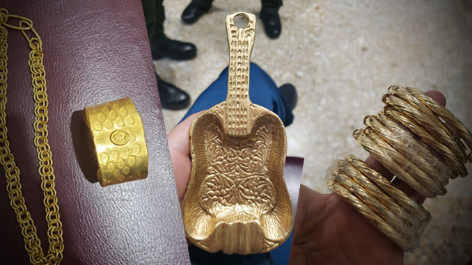 Esta mercancía pretendía salir del país sin formalidades aduaneras y se encontraban cadenas de oro, pulseras, entre otros artículos que pretendían pasar los controles al ser camuflados con pintura gris y tejidos. pic.twitter.com/DQZaNP7gSO