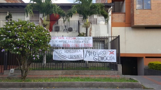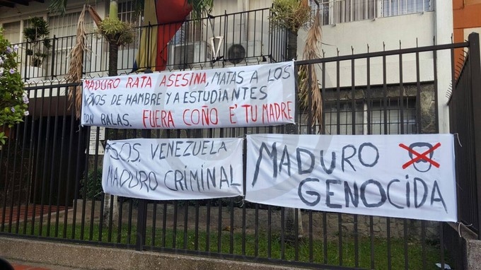 Según el reporte ciudadano las personas que acudieron al lugar, ubicado en el barrio Laureles, colgaron de las rejas que protegen al consulado varios mensajes en contra del presidente de Venezuela, Nicolás Maduro.