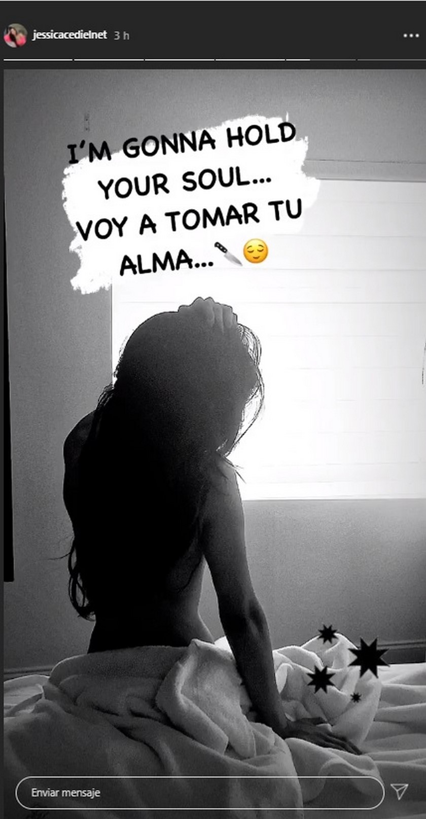 A través de sus historias de Instagram, Jessica dejó ver su espalda con una pose seductora mientras estaba sentada encima de una cama.