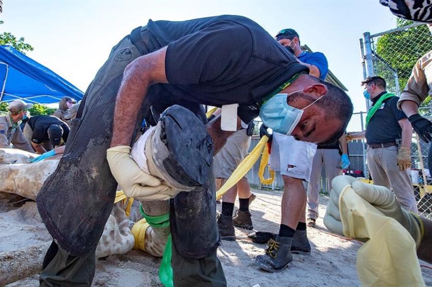 Un equipo multidisciplinario de más de 24 personas logró inmovilizar en Miami a una jirafa de casi 2.000 libras de peso (907 kilogramos) con dos patas fracturadas, para colocarle zapatos de goma hechos a medida y tomarle radiografías, operación que el parque de Florida (EE.UU.) calificó de “reto extremo”.