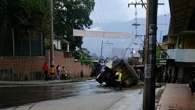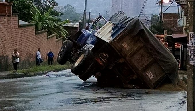 En una calle del barrio Playa Rica de Bello quedó incrustada a medio cuerpo una volqueta que transitaba por el sector comprendido entre la calle 63 con carrera 62b.