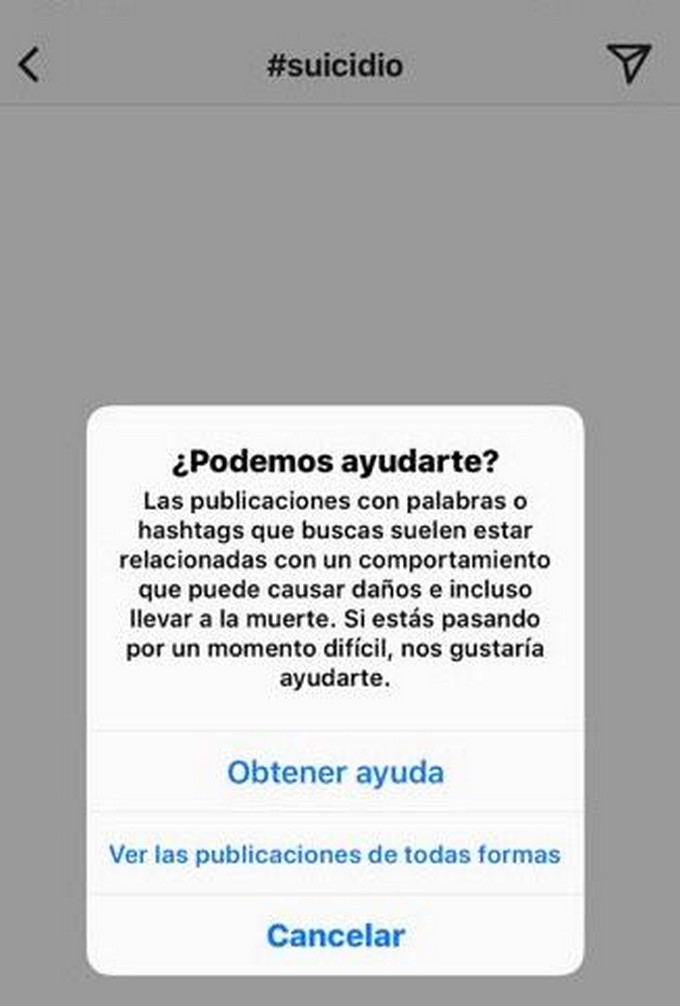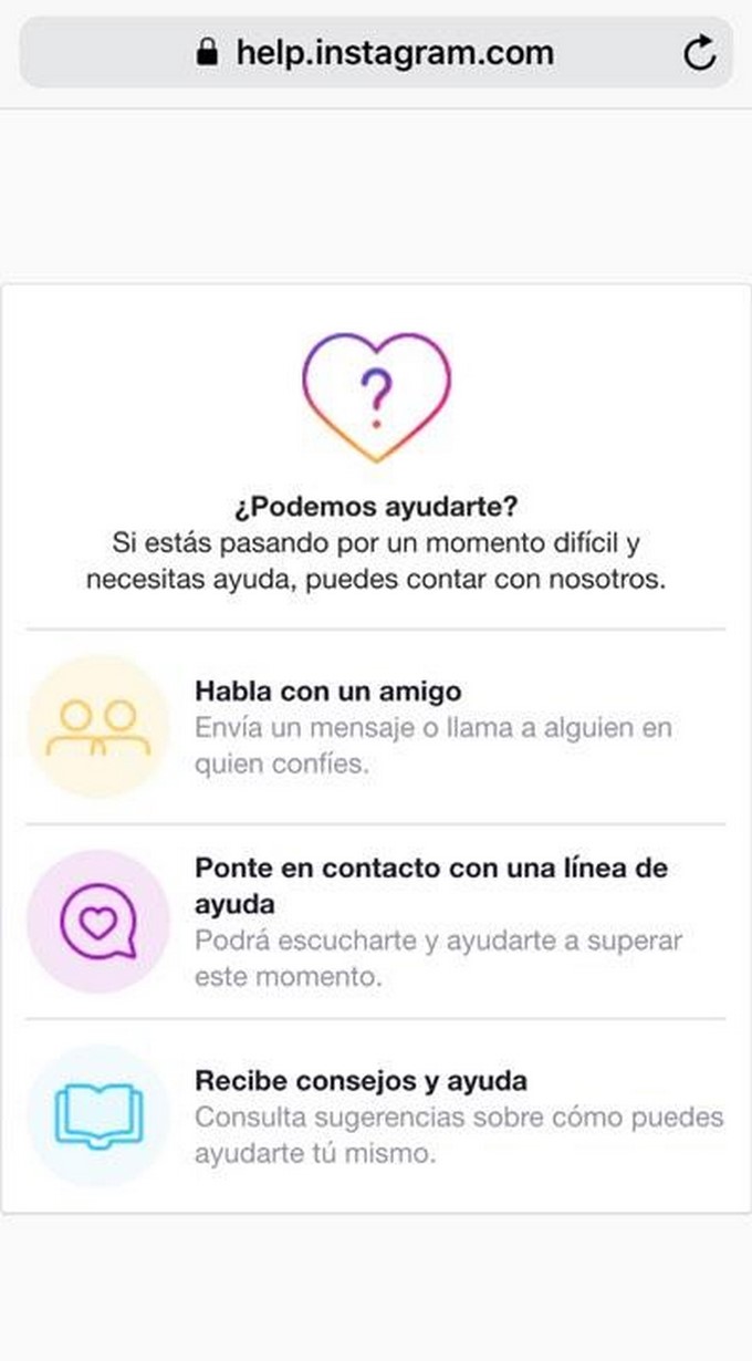 Dicho mensaje incluye un enlace hacia una página de asistencia de Instagram, donde los usuarios pueden buscar ayuda en momentos difíciles, como hablar con un amigo o recibir consejos.