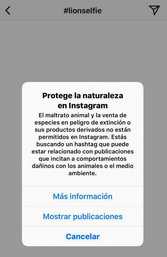 Además Instagram también tiene mensajes similares cuando una persona trata de subir ‘selfie’ o usar hashtag que son usados con comportamientos abusivos en contra de los animales.