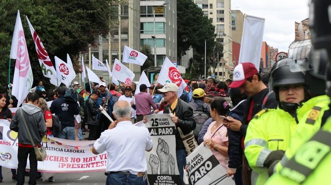 Los integrantes del partido político Farc se unieron a trabajadores, estudiantes y líderes sindicales del país que reclaman por mejoras en la inversión pública y en contra del Plan Nacional de Desarrollo del Gobierno.