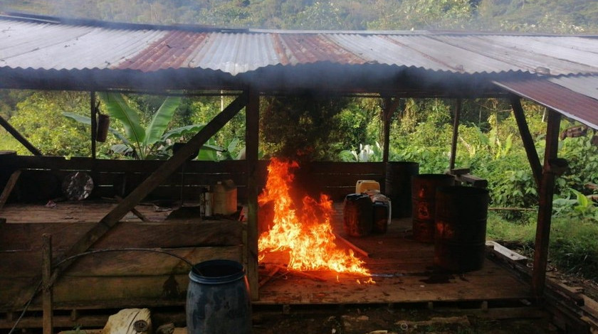 “Allí fueron incautados 2.270 galones de insumos líquidos, 1.240 kilos de insumos sólidos, 770 kilos de hoja de coca macerada, 4 pesas tipo reloj y 3 prensas artesanales, entre otros elementos, para el cultivo y procesamiento de pasta base de cocaína y otros alcaloides”, se detalló en un comunicado.