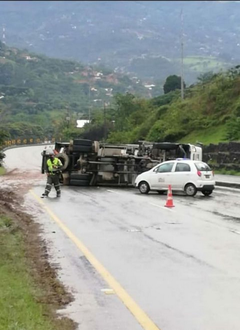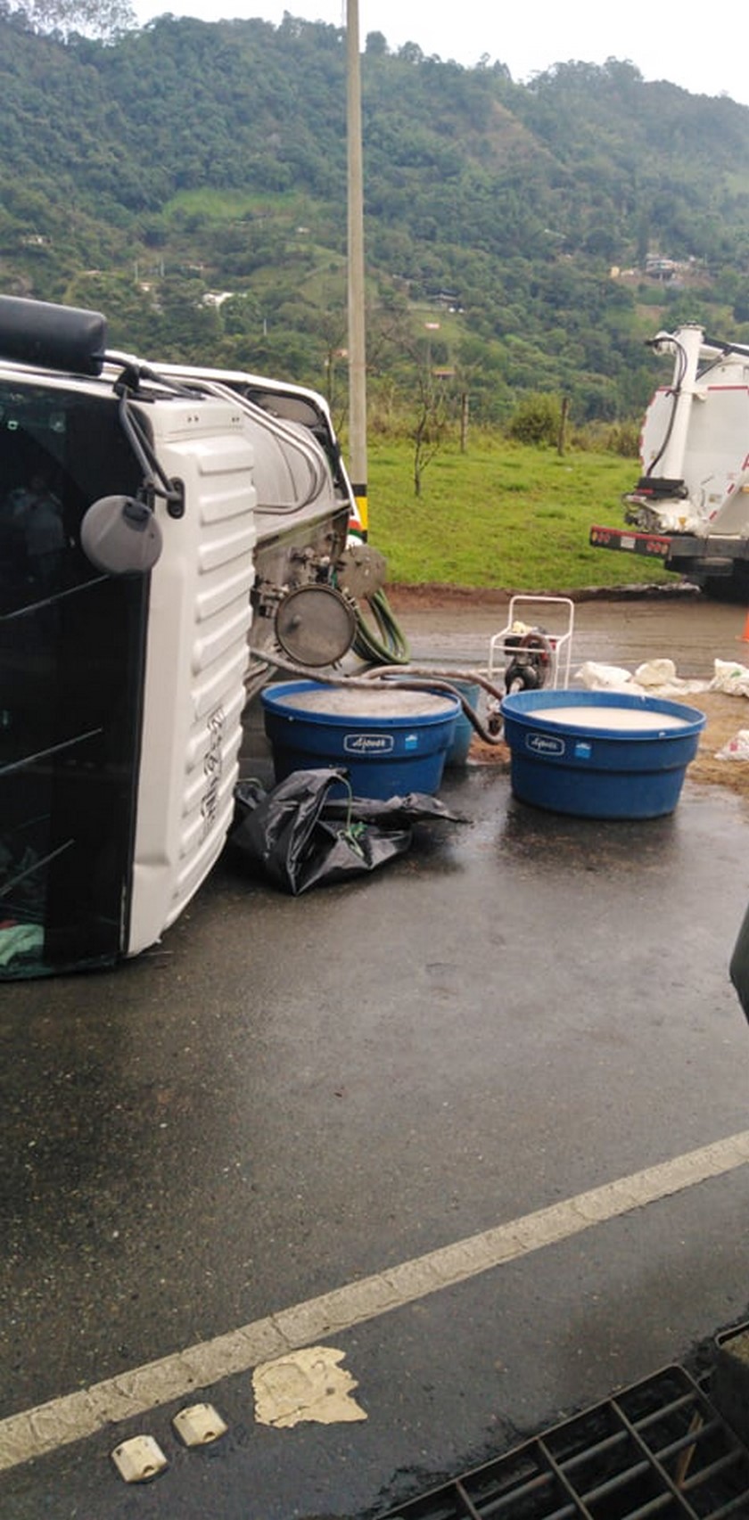 FOTOS: Un camión que transportaba químicos para tratamiento de agua se volcó por Comfama de Girardota