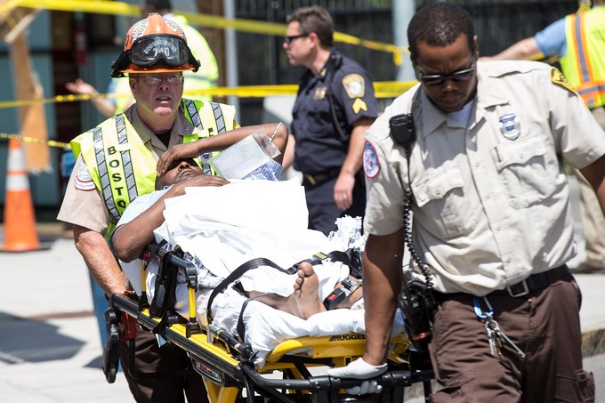 BOS01. BOSTON (ESTADOS UNIDOS), 03/07/2017.- Una víctima herida es sacada de la escena en una camilla después de que un taxi golpease a varios peatones hoy, lunes 3 de julio de 2017, en una zona de parada de taxis en el este de Boston, Massachusetts (EE.UU.). Al menos diez personas resultaron heridas hoy al impactar un taxi contra un grupo de peatones en el este de Boston en un suceso que las autoridades están investigando como un posible accidente. EFE/KEITH BEDFORD /THE BOSTON GLOBE