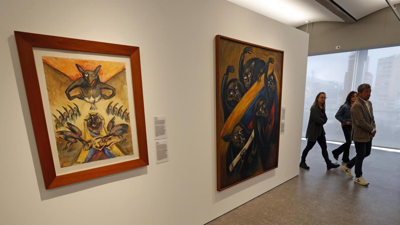 Asistentes a la exposición de la pintora colombiana Débora Arango observan las obras “Huelga de Estudiantes” y “Melgar” hoy, en la Sala de Arte de la sede de Bancolombia, en Bogotá (Colombia). EFE/Mauricio Dueñas Castañeda