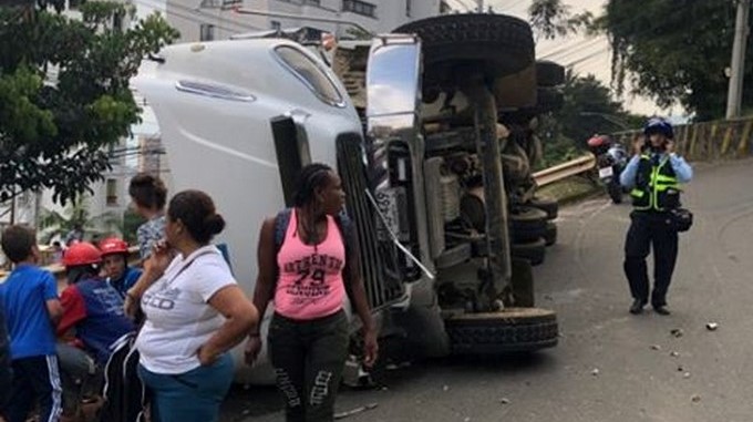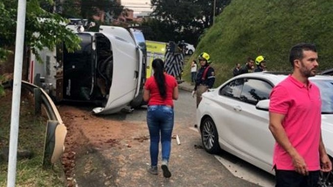 Un accidente de tránsito se presentó sobre las cinco de la tarde de este lunes 8 de abril, en la transversal superior, ubicada en el barrio El Poblado. En las imágenes se puede apreciar que los implicados son una volqueta, que terminó volteada, y un particular que recibió un duro golpe.