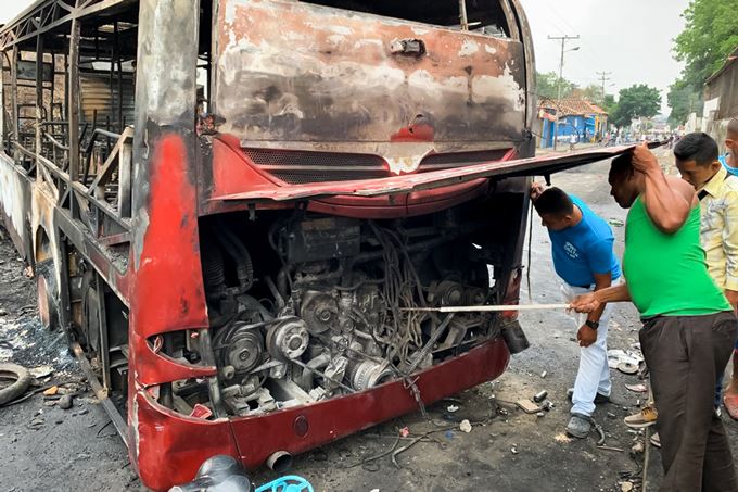 Vista de un autobús carbonizado en una de las calles aledañas al Puente Internacional Francisco de Paula Santander sobre el río Táchira, la segunda vía terrestre que comunica a Colombia con Venezuela, este domingo, en el municipio venezolano de Ureña, fronterizo con Colombia (Venezuela). EFE