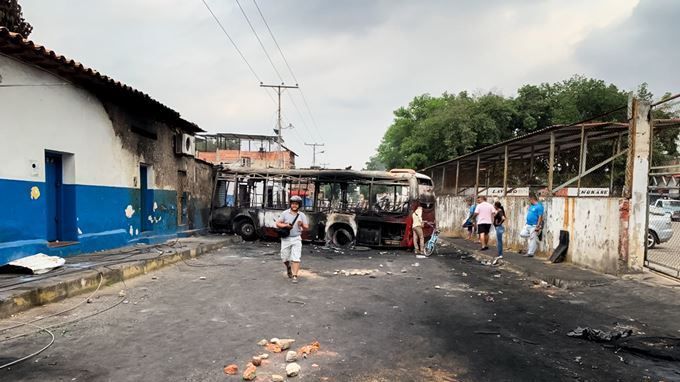 Vista de un autobús carbonizado en una de las calles aledañas al Puente Internacional Francisco de Paula Santander sobre el río Táchira, la segunda vía terrestre que comunica a Colombia con Venezuela, este domingo, en el municipio venezolano de Ureña, fronterizo con Colombia (Venezuela). EFE