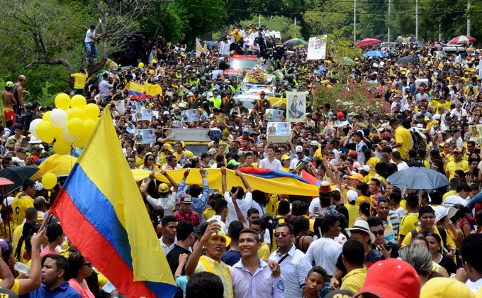 A lo largo del recorrido se congregaron cientos de personas que con globos, banderas de Colombia y arengas saludaban al artista, que hoy fue recordado con las camisetas amarillas que usaba en sus presentaciones y apartes de sus canciones.