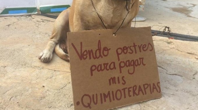 A través de Facebook, una mujer mexicana se volvió viral rápidamente luego de que publicara una fotografía de su mascota, un perrito, que sufre de cáncer y que tuvo que ponerlo a vender postres para así poder pagar su quimioterapia y así conseguir el dinero para su recuperación.