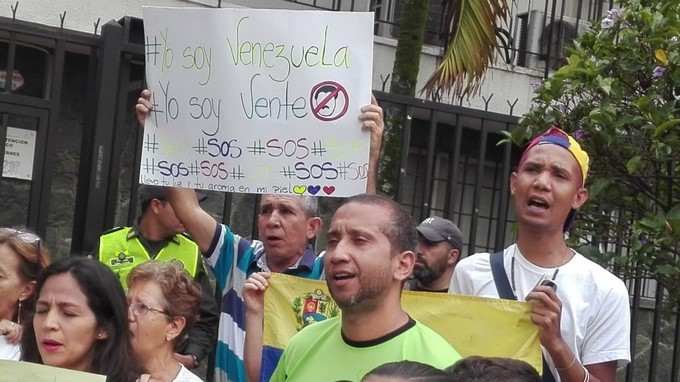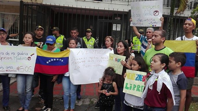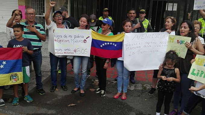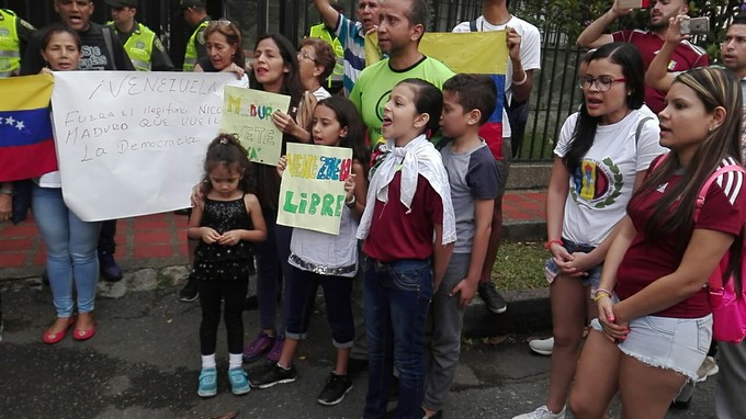 Un grupo de personas de nacionalidad venezolana se reunieron a las afueras del consulado de su país, ubicado en la ciudad de Medellín, para rechazar la posesión Nicolás Maduro como presidente de Venezuela.