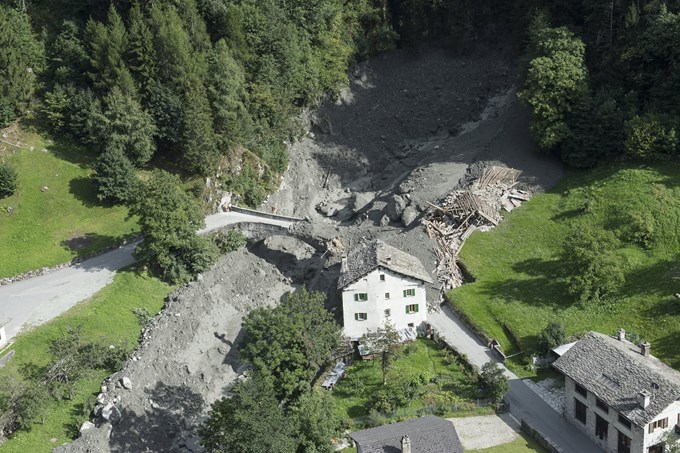 doce establos y viviendas típicas del cantón de los Grisones quedaron completamente destruidas por la avalancha. EFE/Giancarlo Cattaneo