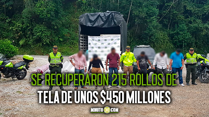 Mediante labores de patrullaje, inteligencia e investigación por parte de las unidades adscritas a la Seccional de Tránsito y Transporte en la vía entre el municipio de Santuario y Cocorná, sector conocido como Caño Alegre, se registró un vehículo tipo camión donde se hallaron 215 rollos de tela, avaluados en $450.000.000.