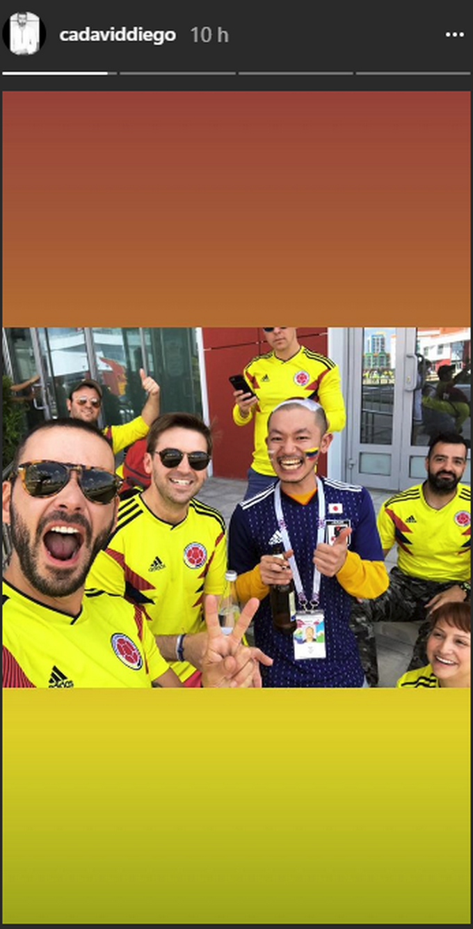 El actor, fotógrafo y músico colombiano Diego Cadavid, también se mostró bastante emocionado por el partido debut de la Selección Colombia, publicó en sus historias una fotografía junto con otros espectadores en Rusia, incluso incluyó hinchas del país contrincante.