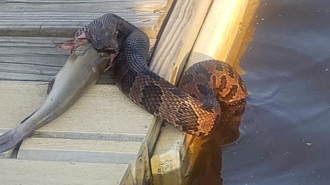 Un ciudadano estadounidense se pasó por muelle en Carolina del Norte, y en ese preciso momento pudo ver como una culebra de agua marrón, como se le conoce en ese país, estaba sobre la madera intentando devorar un bagre que se encontraba muerto sobre el sitio.