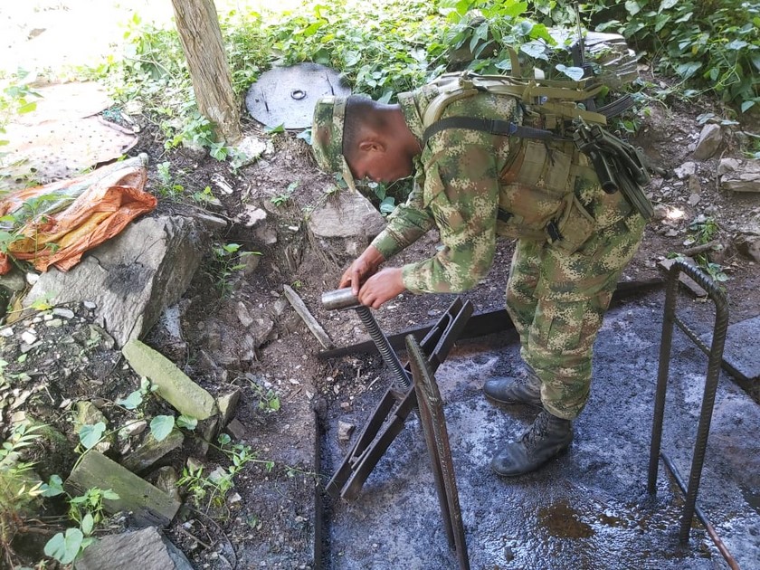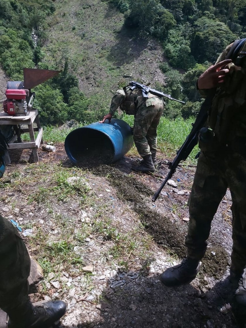En desarrollo de operaciones militares de control territorial, tropas del Ejército Nacional ubicaron y destruyeron un laboratorio para el procesamiento de pasta base de coca en la vereda Pascuita, zona rural del municipio de Ituango, Antioquia.