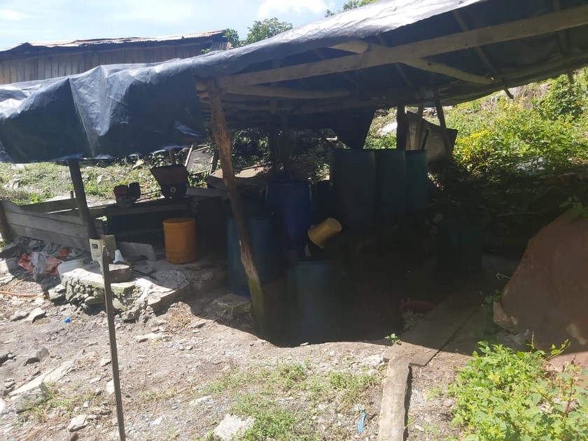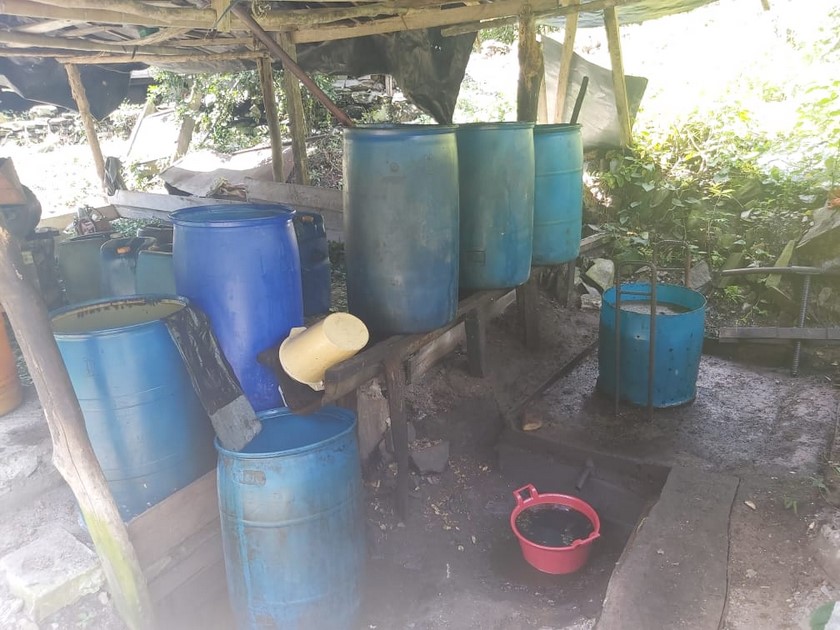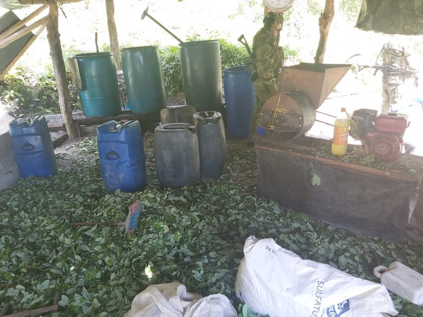 En el hecho se incautaron 40 galones de pasta base de coca en proceso, 50 kilogramos de hoja de coca, 45 galones de insumos líquidos, 100 kilogramos de insumos sólidos y demás materiales utilizados en la producción del alcaloide.