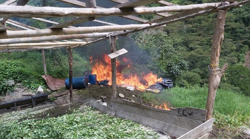 En el hecho se incautaron 40 galones de pasta base de coca en proceso, 50 kilogramos de hoja de coca, 45 galones de insumos líquidos, 100 kilogramos de insumos sólidos y demás materiales utilizados en la producción del alcaloide.