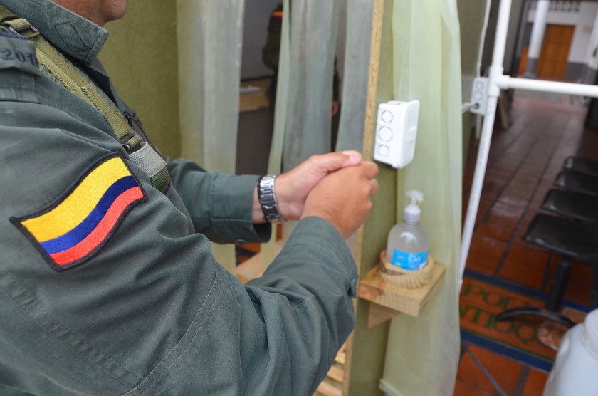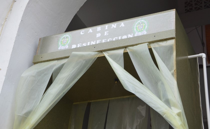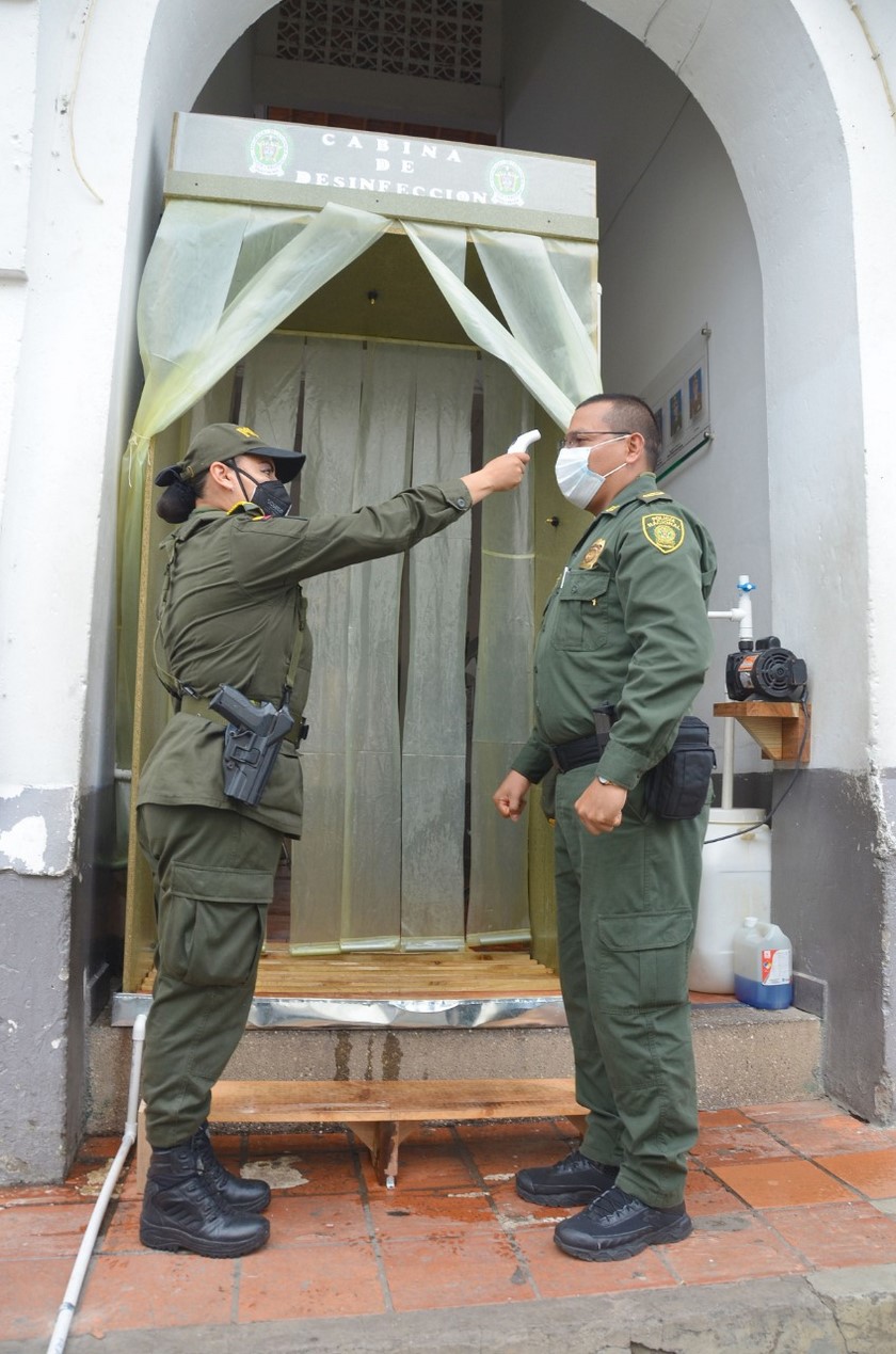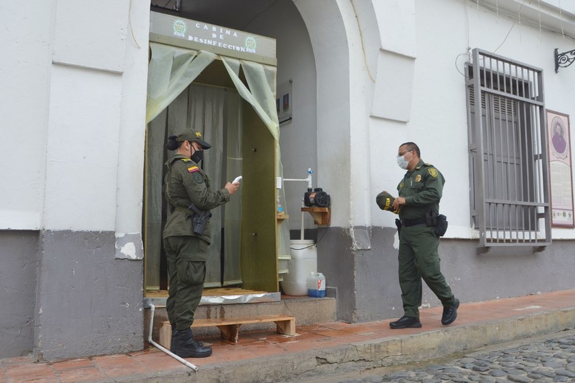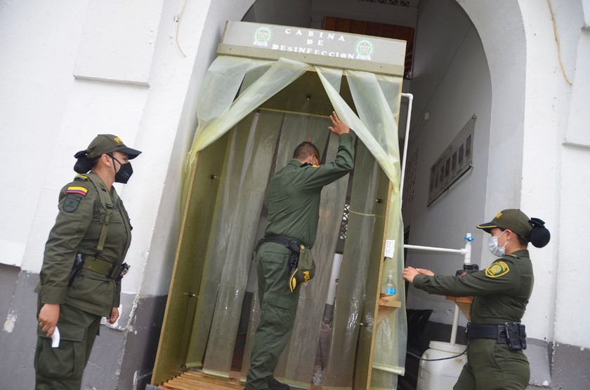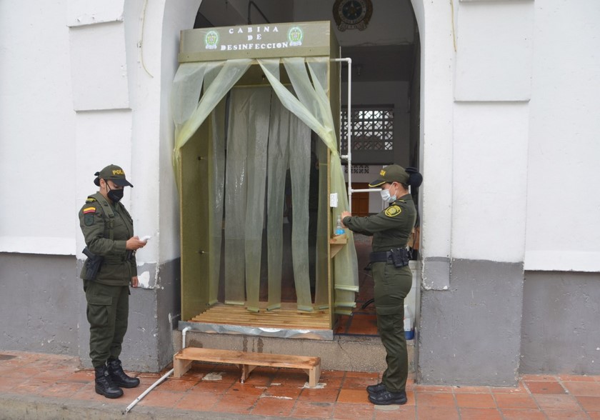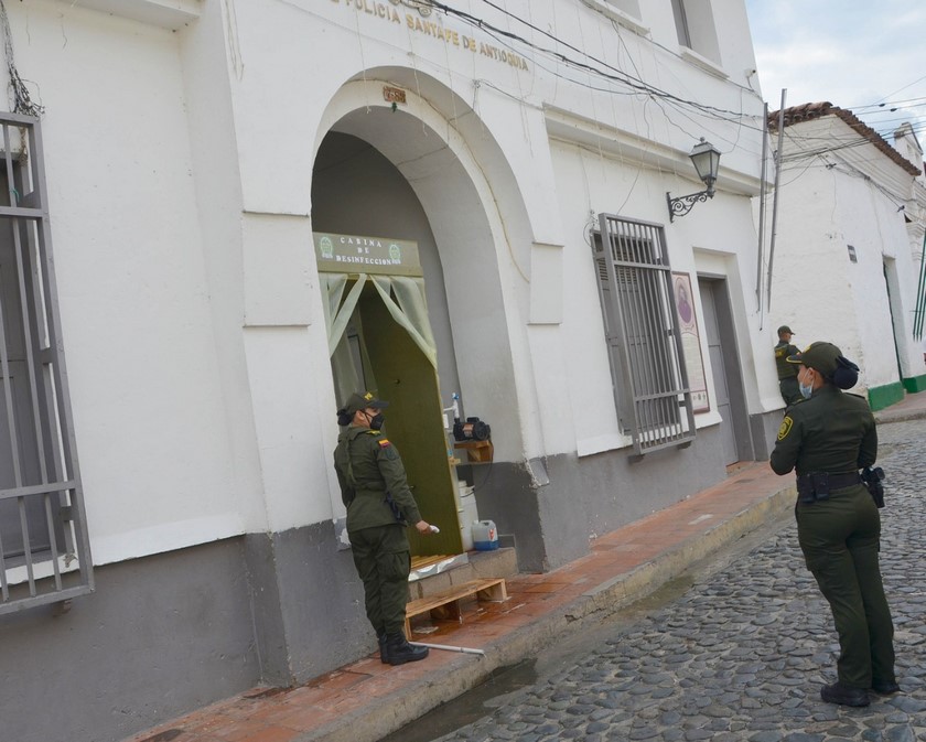 Uniformados de la Policía de Antioquia crearon una cabina para prevenir el contagio del Covid-19 y desinfectar a los integrantes de la institución y a la misma ciudadanía, en el municipio de Santa Fe de Antioquia.