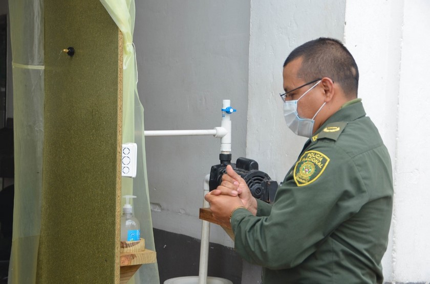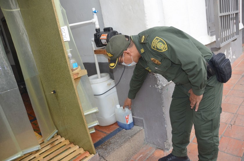 Tal y como detalló la Policía, en coordinación con la comunidad los uniformados se ingeniaron la cabina de desinfección que no mide más de 3 metros de largo y permite proteger a la comunidad de este municipio del Occidente antioqueño.