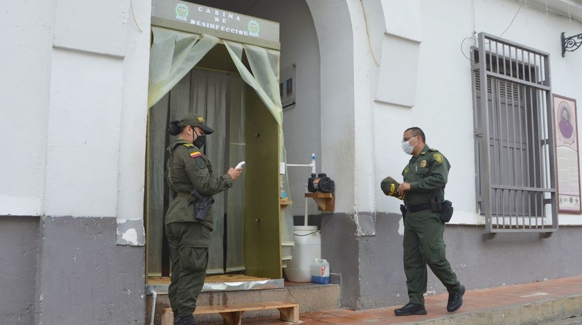 Uniformados de la Policía de Antioquia crearon una cabina para prevenir el contagio del Covid-19 y desinfectar a los integrantes de la institución y a la misma ciudadanía, en el municipio de Santa Fe de Antioquia.