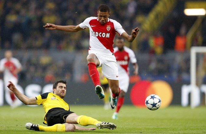 El jugador del AS Monaco, Kylian Mbappe (d), disputa un balón frente al jugador del Borussia Dortmund, Sokratis Papastathopoulos (i). EFE