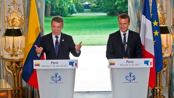 Santos, que se entrevistó ayer con el presidente francés, Emmanuel Macron, finalizó su corta intervención con un guiño a la buena relación entre Colombia y Francia.