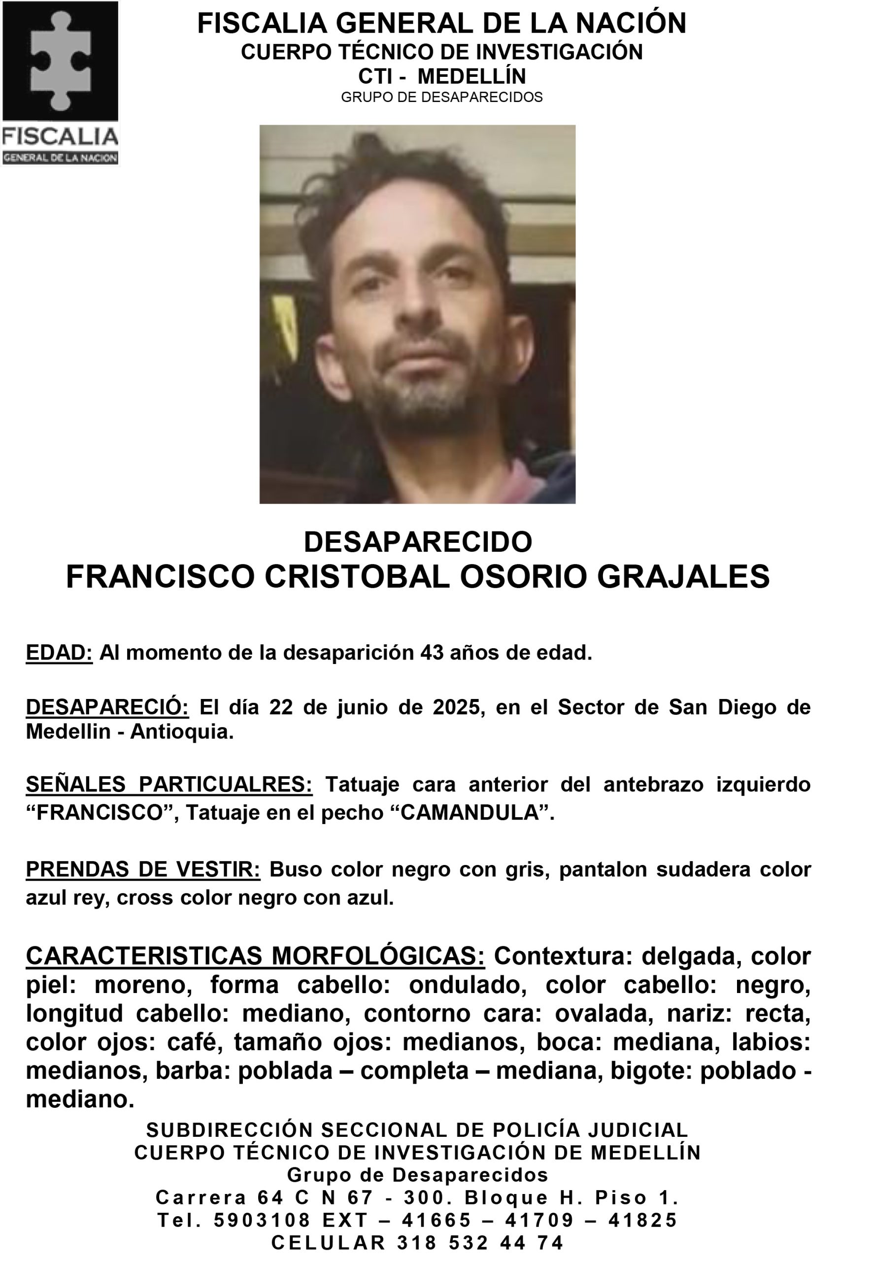 Francisco Cristóbal Osorio Grajales, de 43 años, fue reportado como desaparecido el 22 de junio de 2025 en el sector San Diego de Medellín, Antioquia.