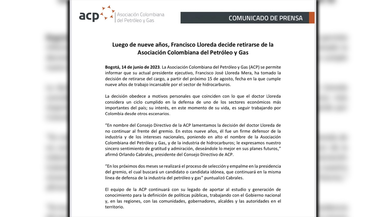 A través de un comunicado, la Asociación Colombiana del Petróleo y Gas -ACP-, informó que Francisco José Lloreda Mera, presidente ejecutivo, dejará el cargo desde el próximo 15 de agosto, fecha en la que cumplirá nueve años en la entidad.