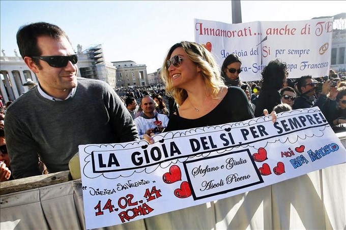 Un distendido y sonriente pontífice se reunió en la Plaza de San Pedro con 20.000 parejas de 28 países de todo el mundo, con motivo del día de san Valentín, en una celebración histórica, denominada “La Alegría del SÍ para siempre”, la primera de este género que se lleva a cabo en el Vaticano.