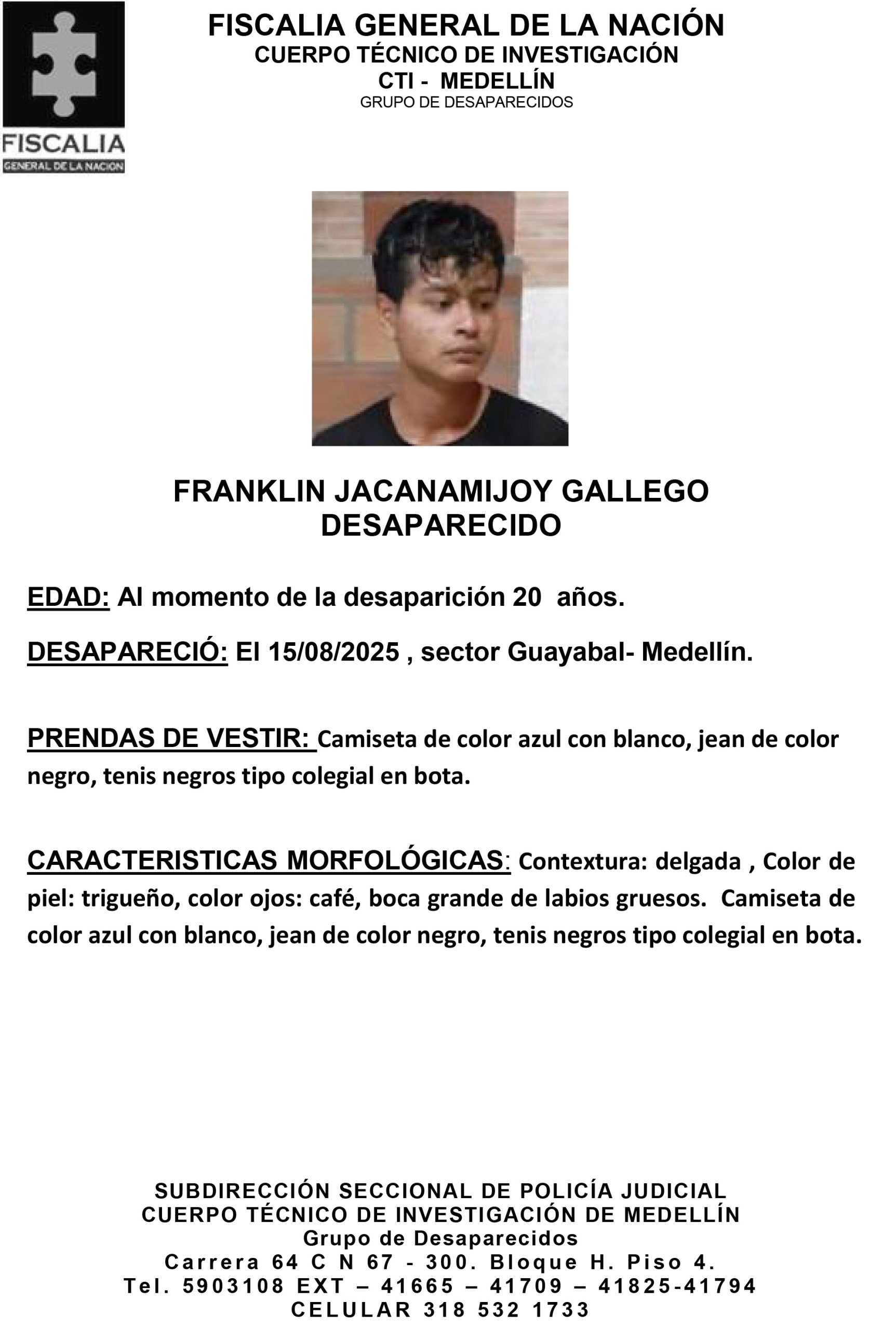 Franklin Jacanamijoy Gallego es un joven de 20 años que fue reportado como desaparecido el 15 de agosto de 2025 en el sector Guayabal de Medellín.