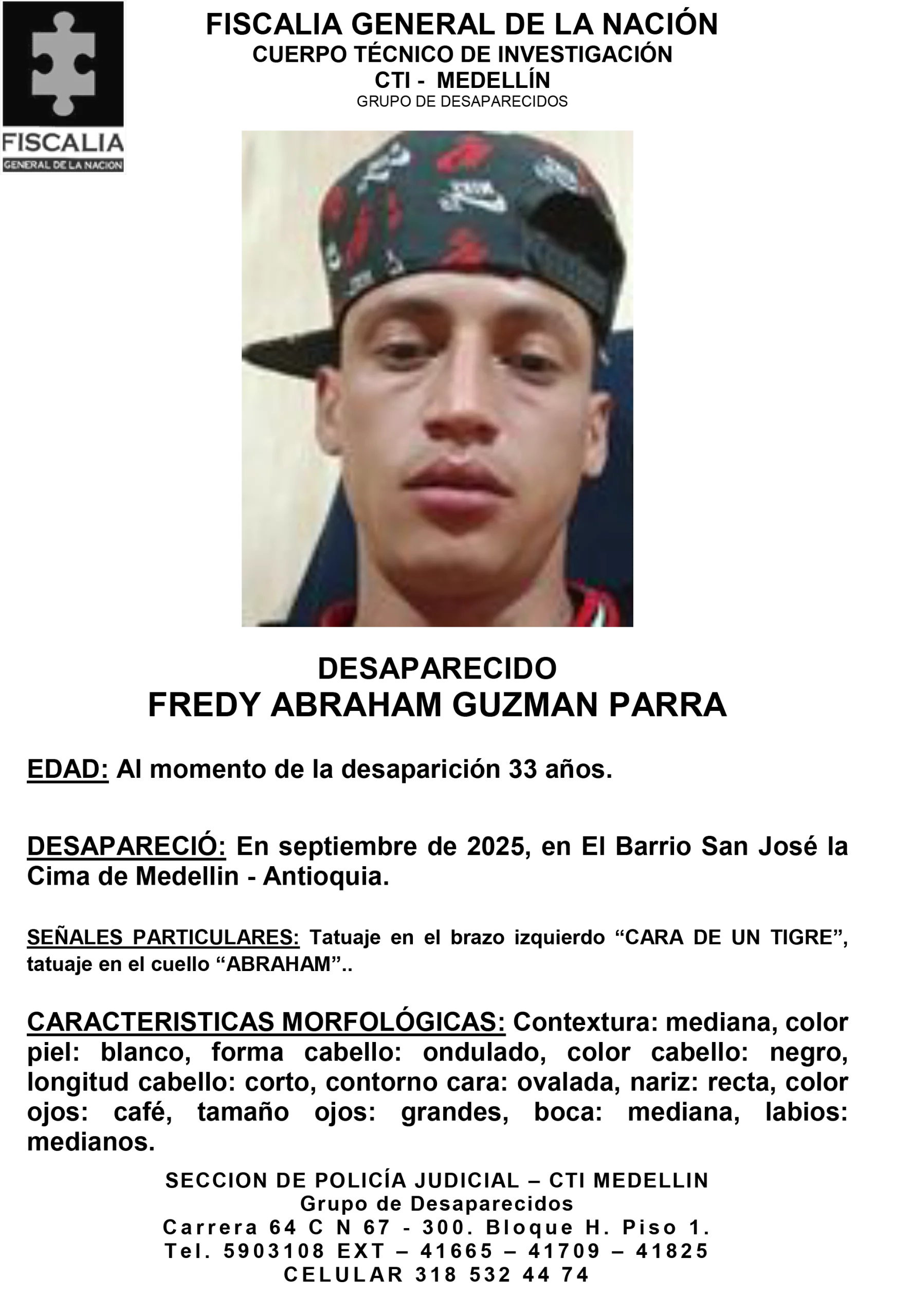 Fredy Abraham Guzmán Parra tenía 33 años al momento de su desaparición. Fue visto por última vez en septiembre de 2025 en el barrio San José La Cima, en la ciudad de Medellín, Antioquia.