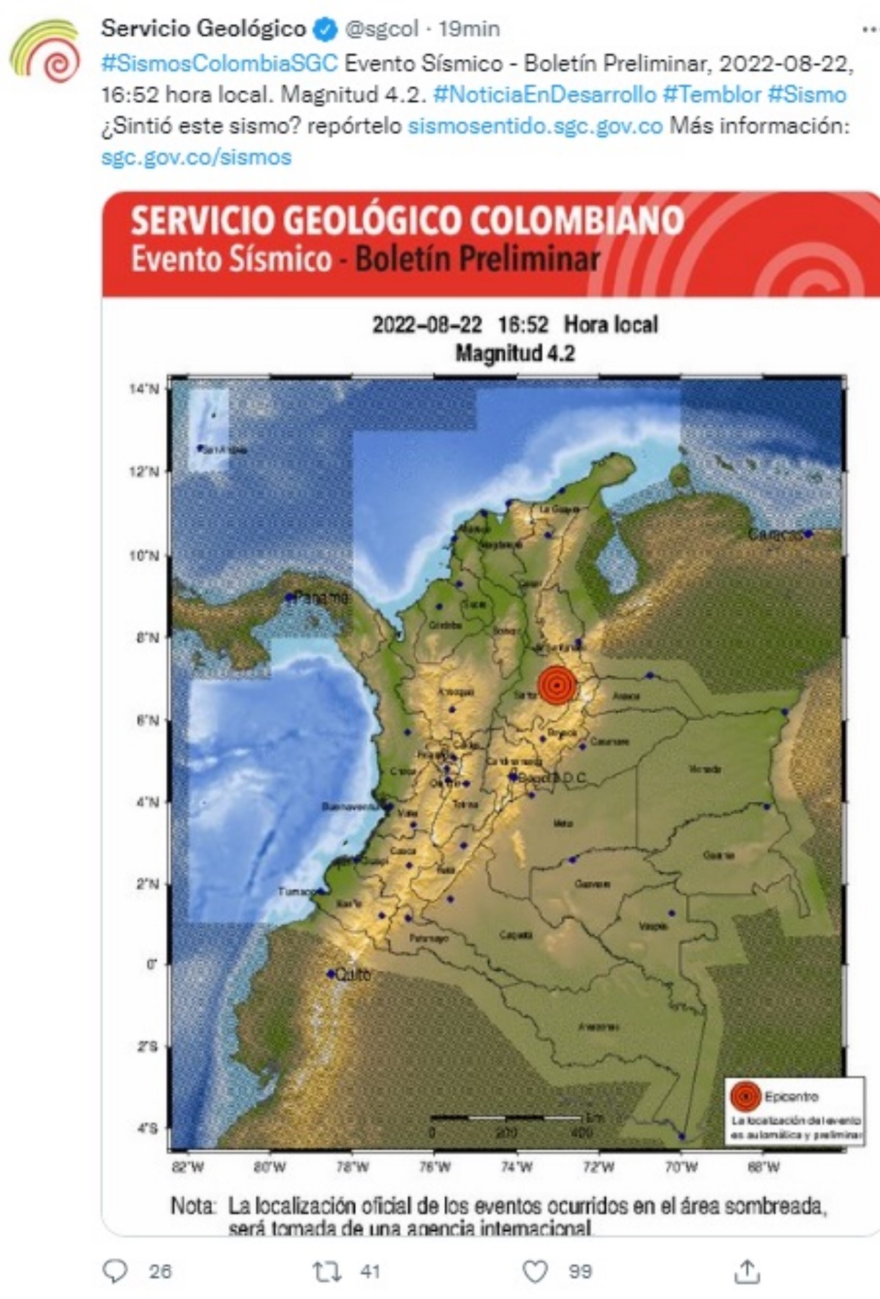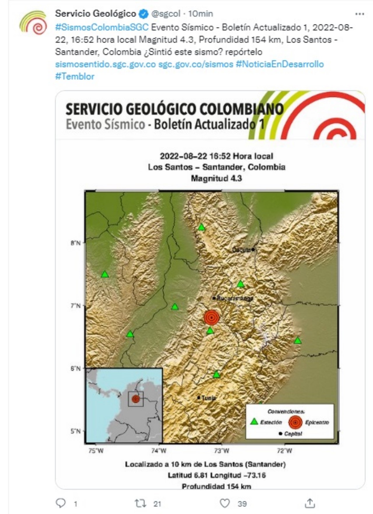 El Servicio Geológico Colombiano detalló en su cuenta de Twitter que en la tarde de este lunes que se presentó un sismo en Santander.