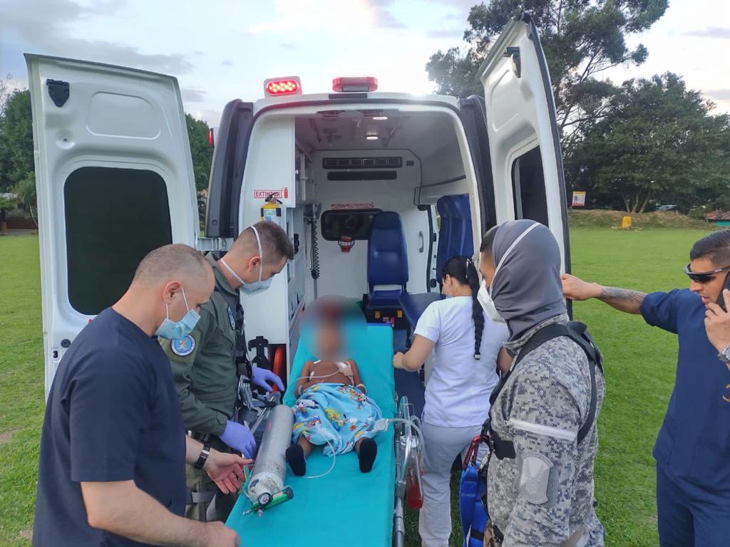 Durante el vuelo hacia Medellín, médicos militares y rescatistas de personal de la Institución Aérea monitorearon los signos vitales del niño, garantizando condiciones óptimas y estables hasta el Batallón Pedro Justo Berrio, donde la esperaba una ambulancia para trasladarla a un centro médico de mayor nivel.